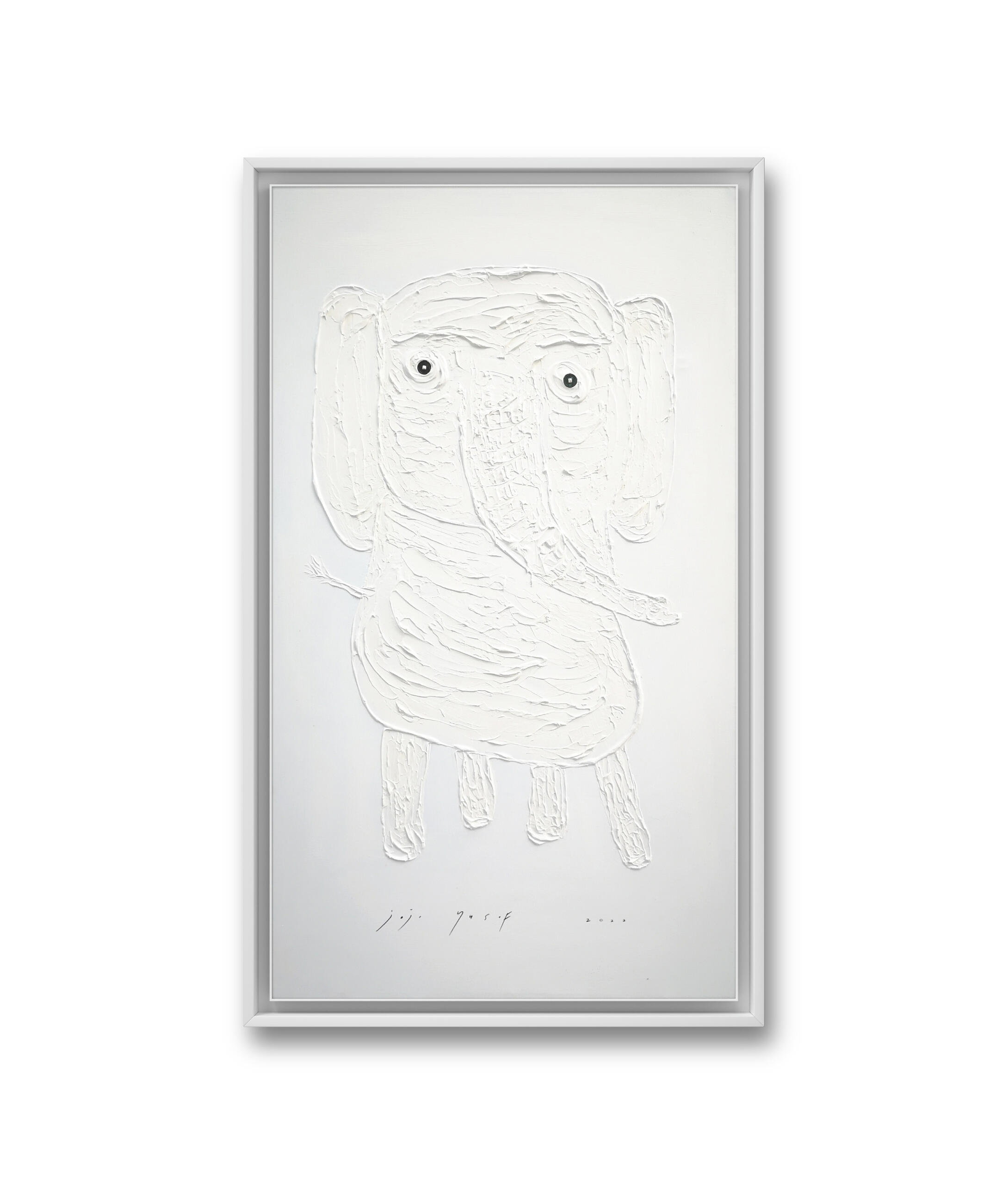 This painting shares a touching story featuring a white elephant, a symbol for a father. The son, who painted the elephant, a symbol the one praying for his father to find peace in heaven.The white color of the elephant symbolizes purity, capturing the essence of a heartfelt wish for his father's peaceful journey to a heavenly realm. To make this happen, he needs to keep doing good things and be a kind person.